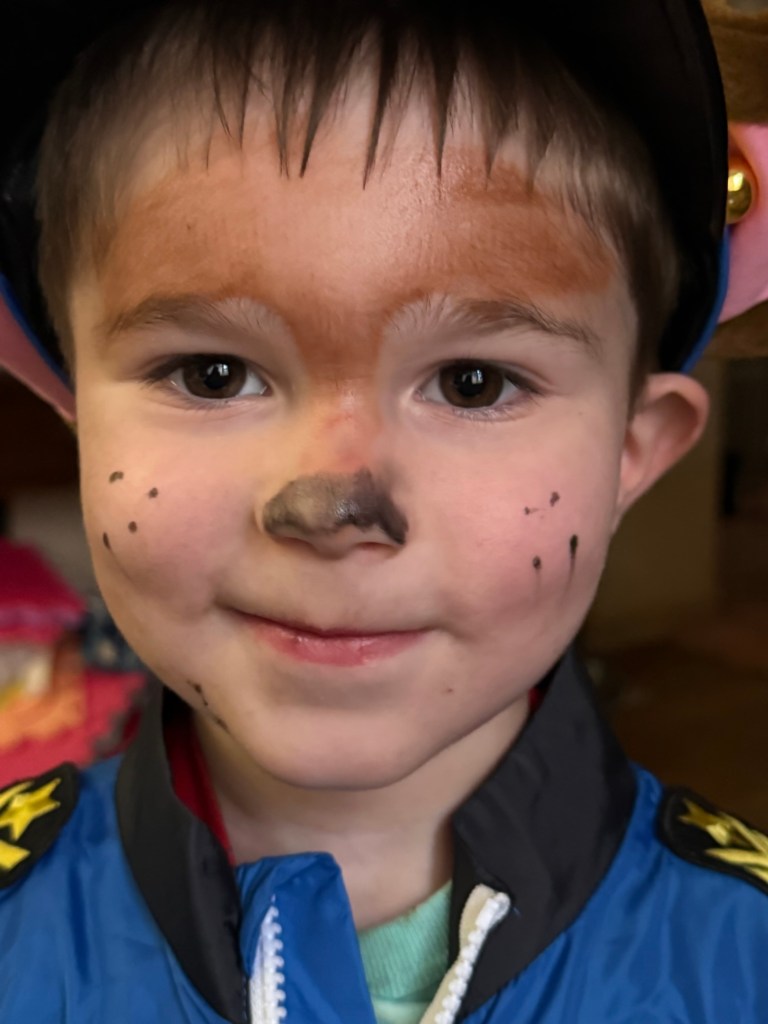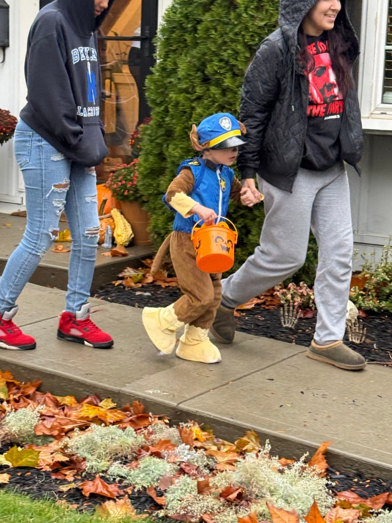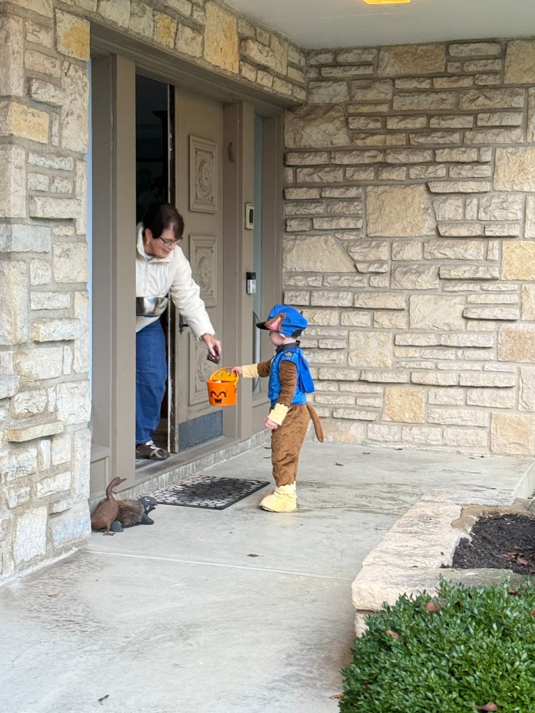 One group of high school girls gave a huge “awwwww” when he said thank you. He also impressed us by answering “Happy Halloween” to a few people. The biggest laugh for us came when a friendly neighbor said “Bye” to which he replied, “Bye! Love you!”