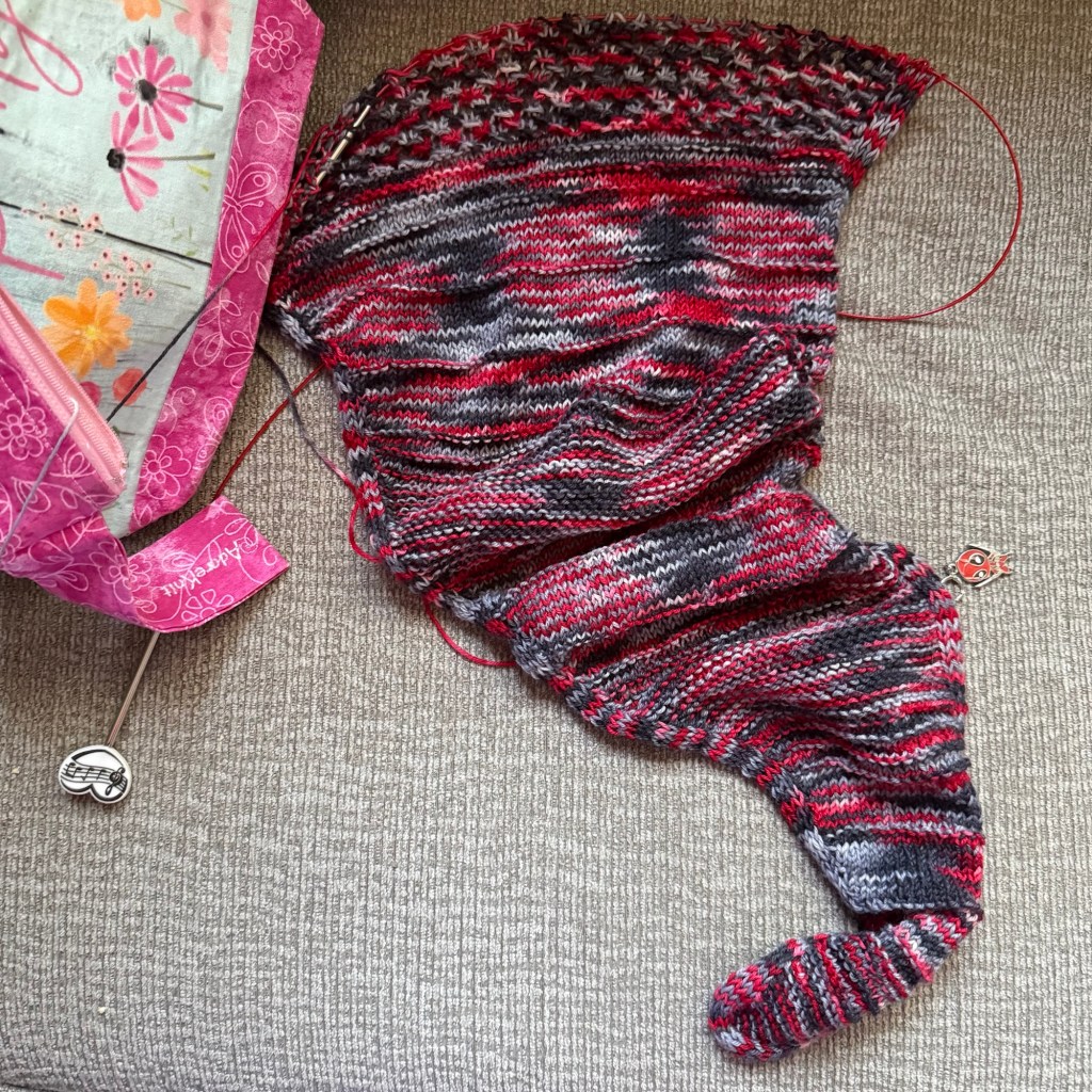 And I made excellent progress on my shawl, having some bonus couch time on Friday and Saturday! The lace panel marks the center of the shawl, so I need to pay closer attention to my remaining yarn!