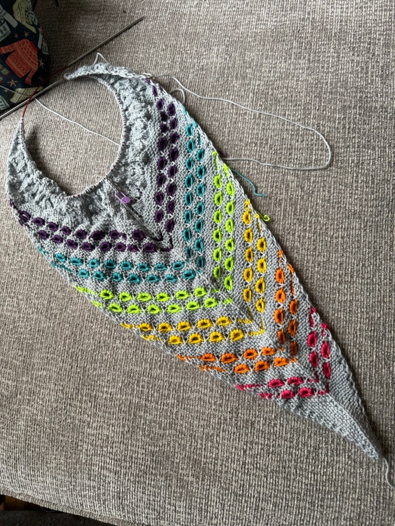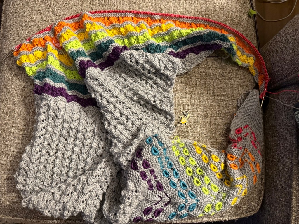 The other project that has dominated what little knitting time I’ve had has been the rainbow shawl I started at the beginning of the month. It’s been my primary project because it’s my December challenge project in the Down Cellar Studio’s Pigskin Party, using 4+ minis within the item. While I should have had an easy time working on a few rows a day throughout the month, my plans got derailed and my knitting mojo took a break vacation. Thankfully, I’ve had some peaceful time over the holidays to dedicate time to knitting. As of today, I have 58 rows to go, including the bind-off. That’s fewer than twenty rows per day, and I’ve been averaging 24-26 rows since Christmas, so this is quite do-able!