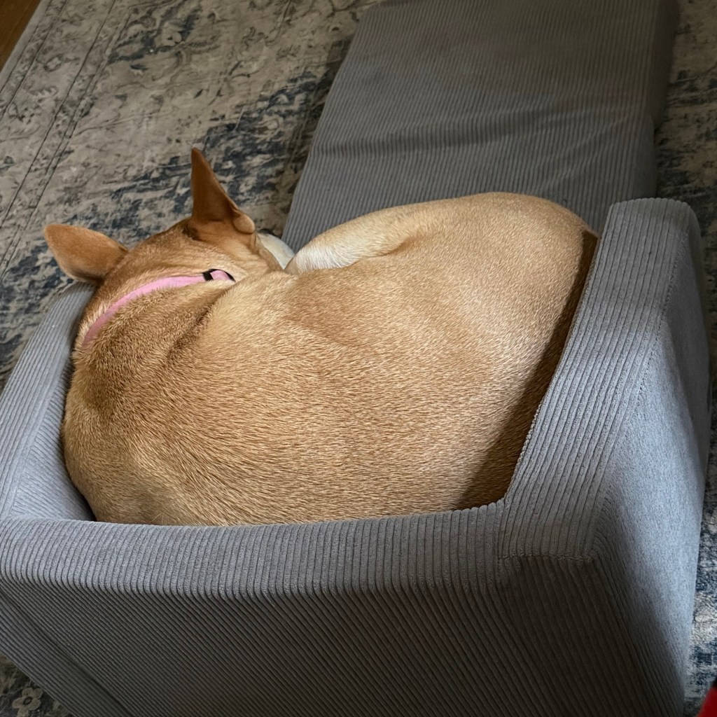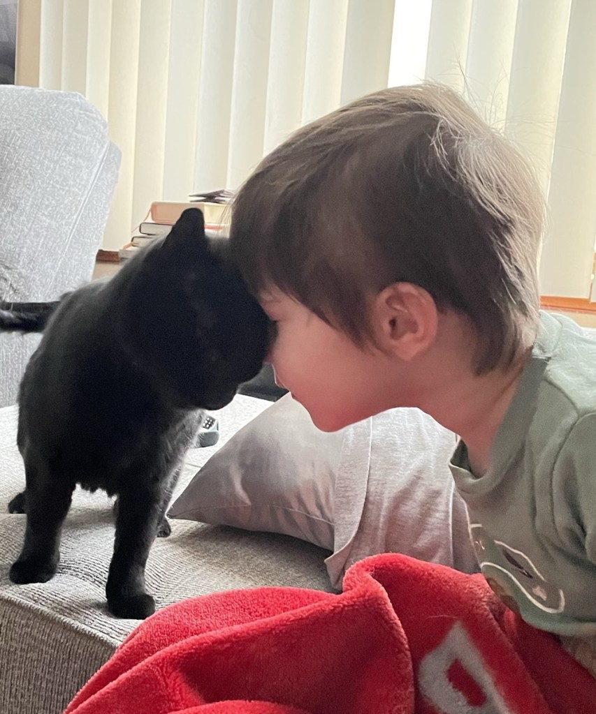 I’ve got a couple sweet photos of the munchkin to share. Now that River is feeling more acclimated to her home and surroundings, she’s become more tolerant of the toddler. Just before I started writing, she even let him pet her. This is a huge accomplishment since just a couple weeks ago she wouldn’t let him within two feet of her unless he was seated with an adult helping to control his movements!