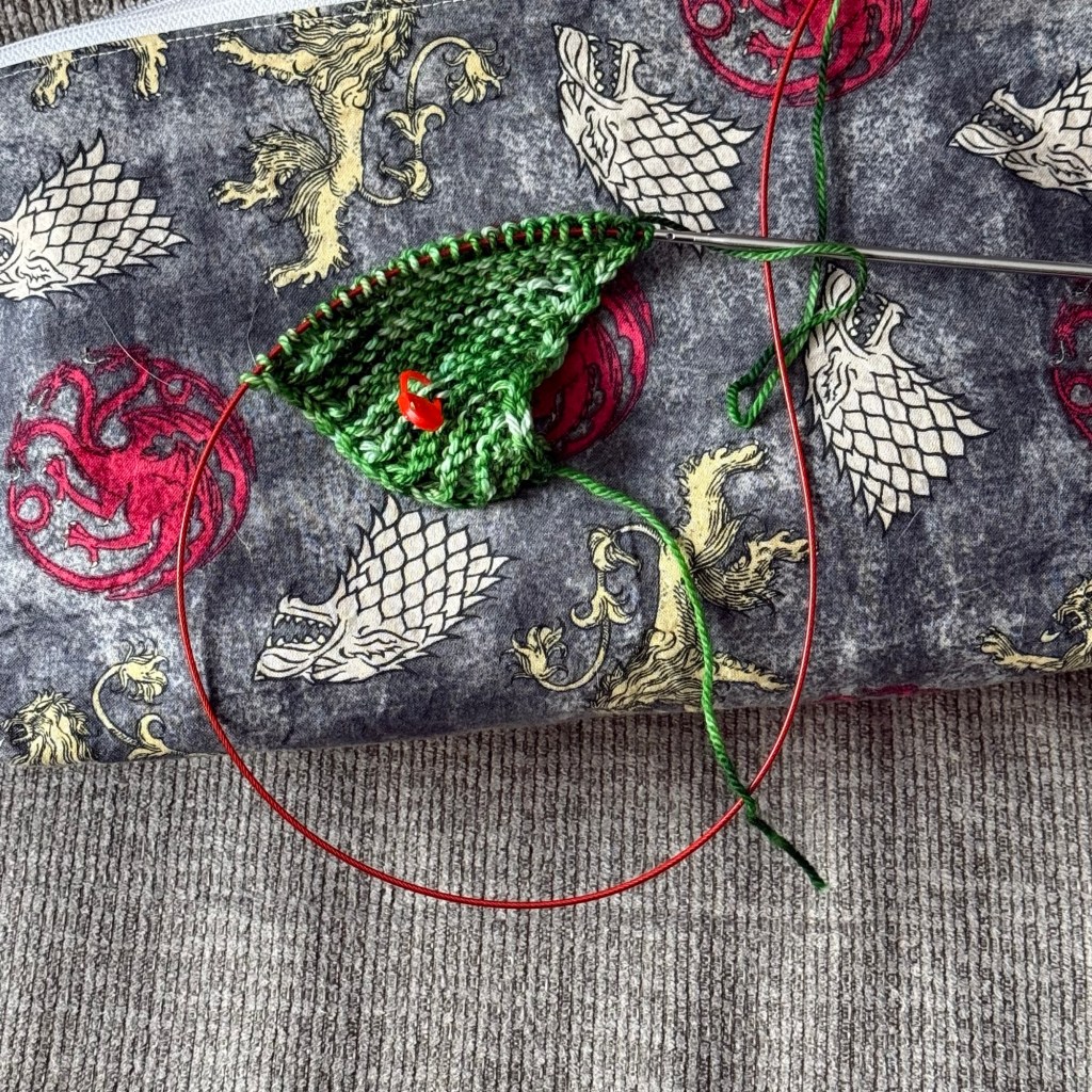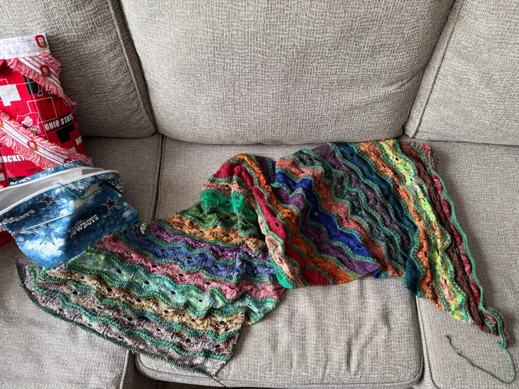 I stayed well on track with the Advent wrap, and as of last night, I am 95% complete with only one remaining mini to add to the project. I should be able to finish the knitting today so I can block it this week. I don’t expect this will be a blitz project in the Down Cellar Studio Pigskin Party, since that requires 1,000 yards or more to qualify. But the yarn dyer is a sponsor, so I will get some bonus points for using her set. And I’m looking forward to seeing the whole set assembled. I’ve already got some thoughts about what to do with what’s left of the minis, as there’s plenty!