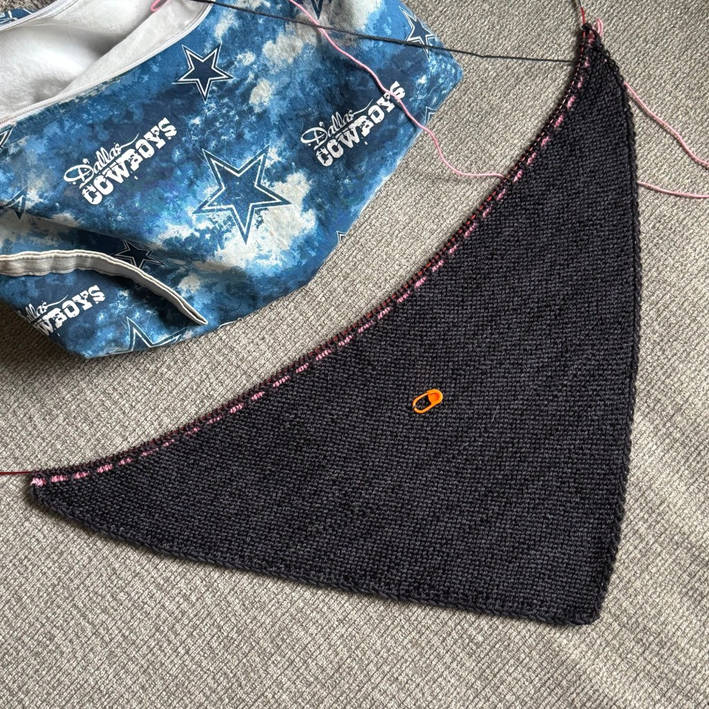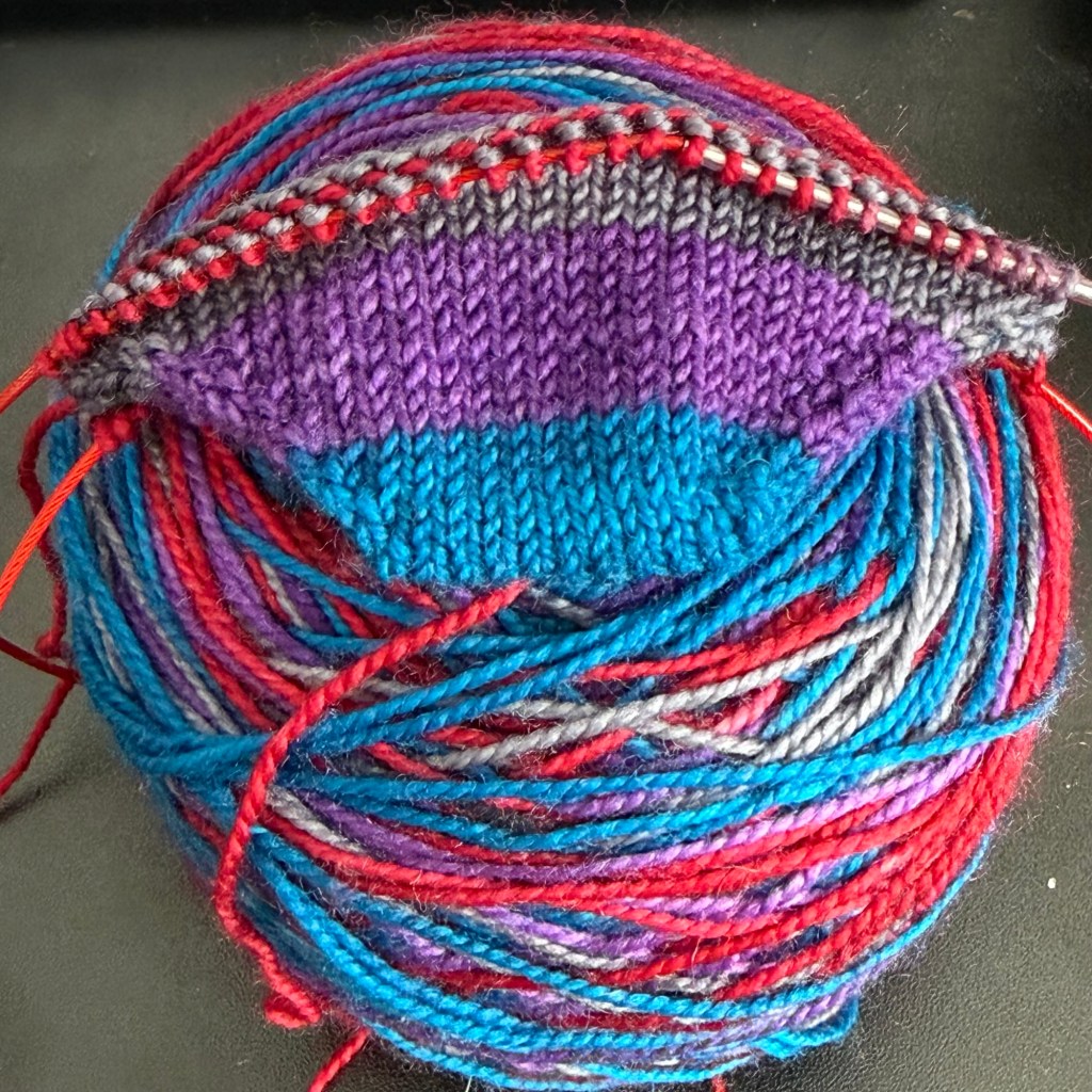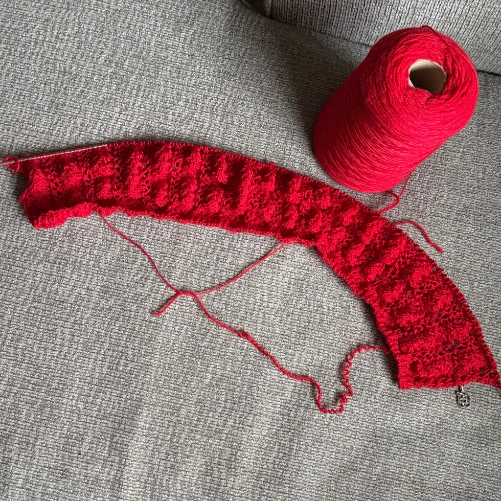 I’m also continuing to work on the cardigan I’d started in the prior week. This is a cone of fingering weight yarn I bought in Ireland in April 2024. I’m just a few repeats away from moving on to the back. I need to revisit the pattern to confirm how I’ll be using Stitch Saver since it will help me avoid having to pick up stitches.