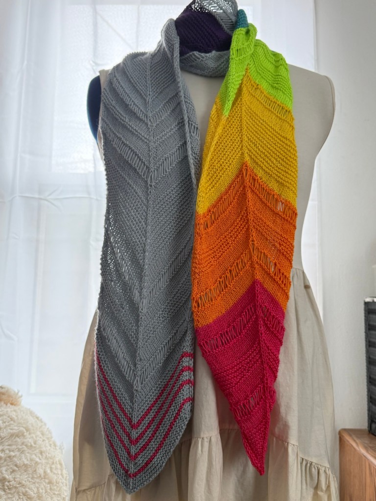 Just as expected, I did cast on a shawl after I bound off the rainbow scarf. I’d worked out my spreadsheet to complete this in early June as usual, but then I realized that I had misread the pattern and I had expected a lot more stitches than needed – I set a per-day stitch goal to meet my deadlines, whether externally imposed (often for imaginary points) or internally set (otherwise I wouldn’t finish things). Once I realized the error, it turns out I’m a couple days ahead of target! That doesn’t mean I’ll slow down, but I can give myself some grace if life gets too lifey at some point in the next couple months.