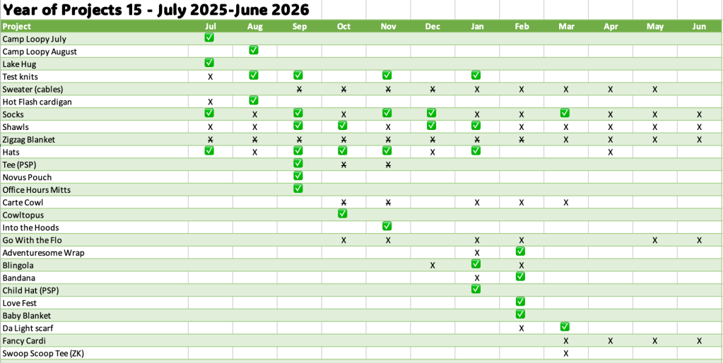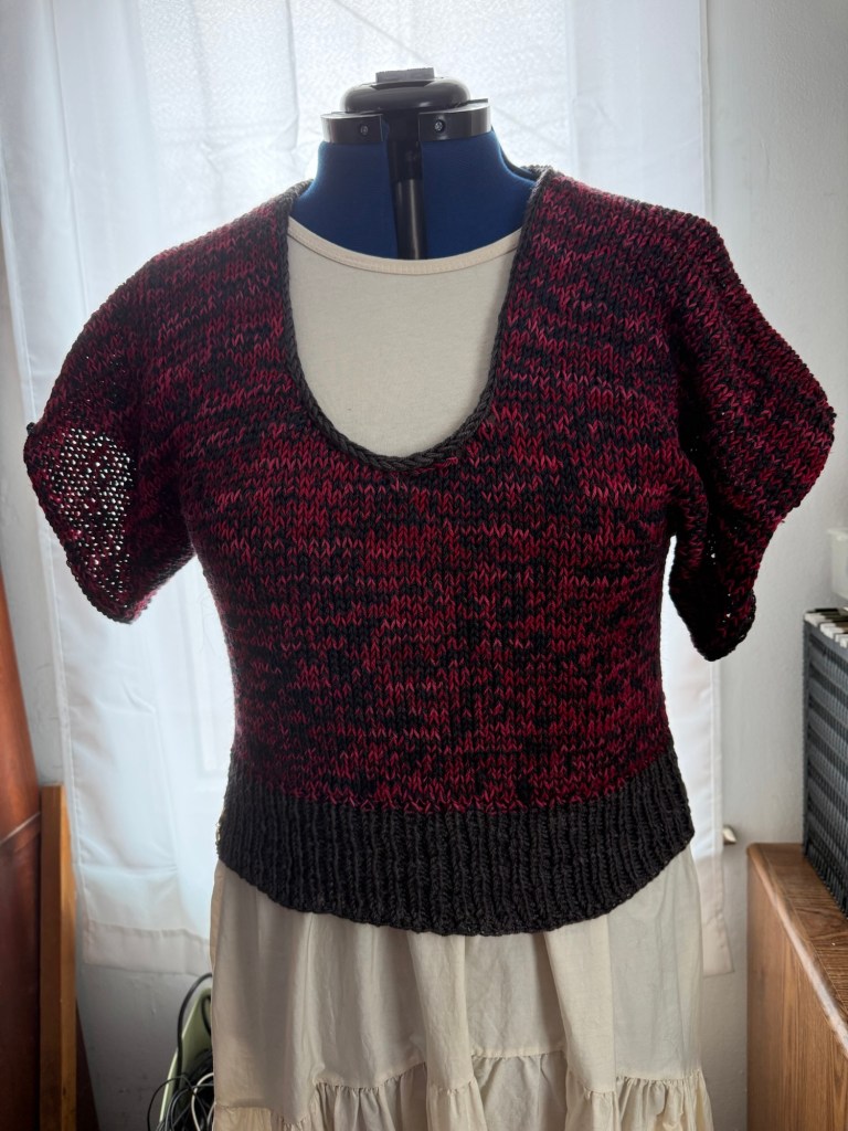 I also technically finished the tee I was knitting; but after I bound off per the pattern, I confirmed that the neckline plunges a bit low for my taste. I’m working on knitting an inset to fill in some of that space, so I’ll have another FO picture next week.