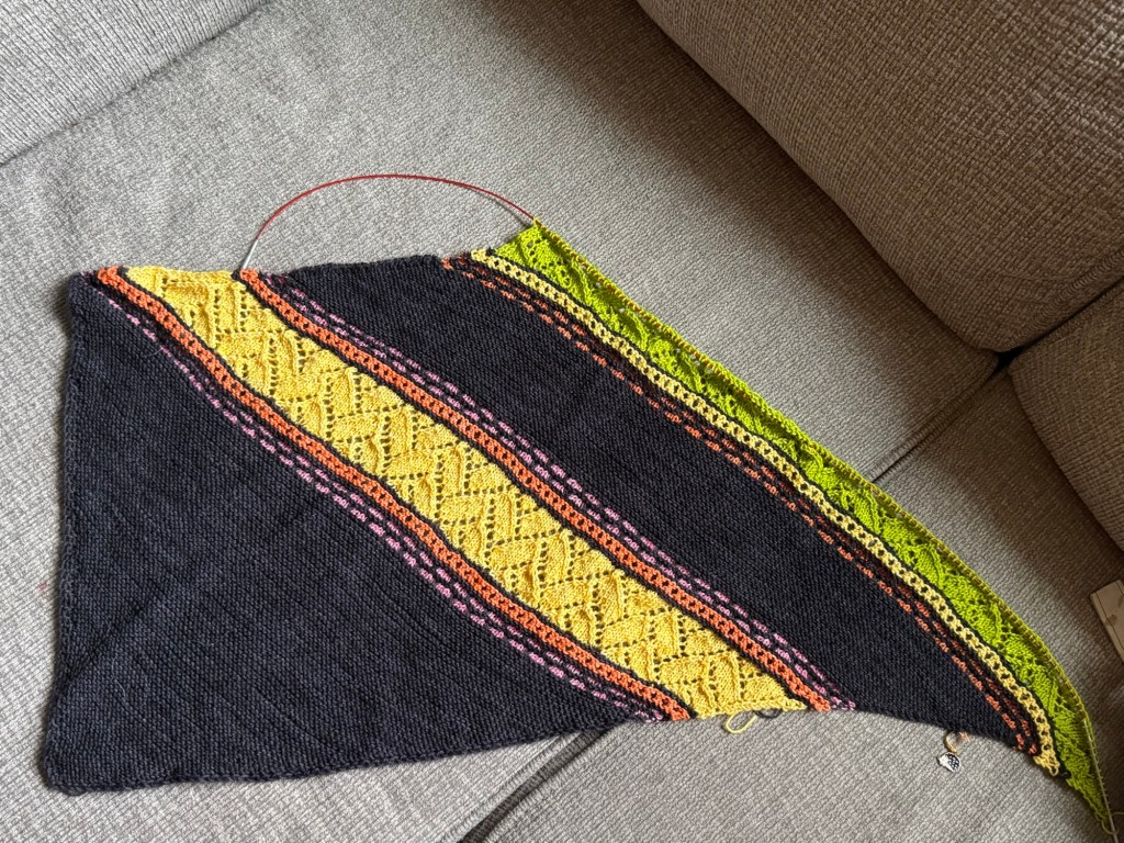 The shawl got attention most of the week, but because of my travels, my progress stalled a bit. I’m still on schedule thanks to exceeding my daily targets earlier in the week and month.
