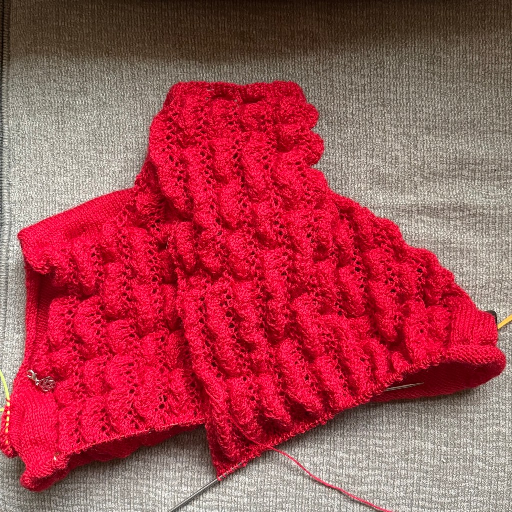 The cardigan got LOTS of attention, mostly because I’m behind schedule on it. The stitch pattern is well-memorized now; but now that I’ve joined the body, I have to pay attention to my row count since there are some increases to flare the body.