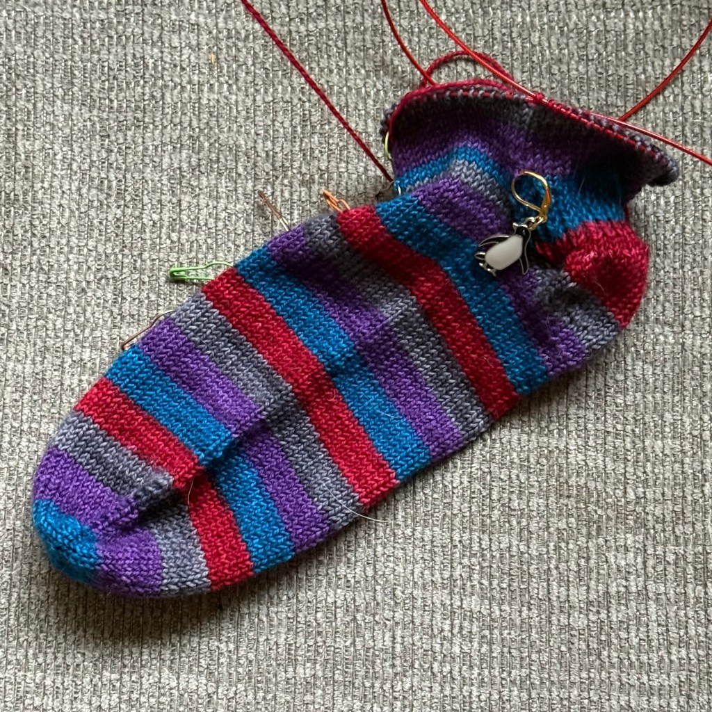 I’ll start with the lowest end of the activity spectrum: the vanilla socks. I actually did more on this than I thought! There should be plenty more progress this week because there’s another home football game and maybe a movie or two.