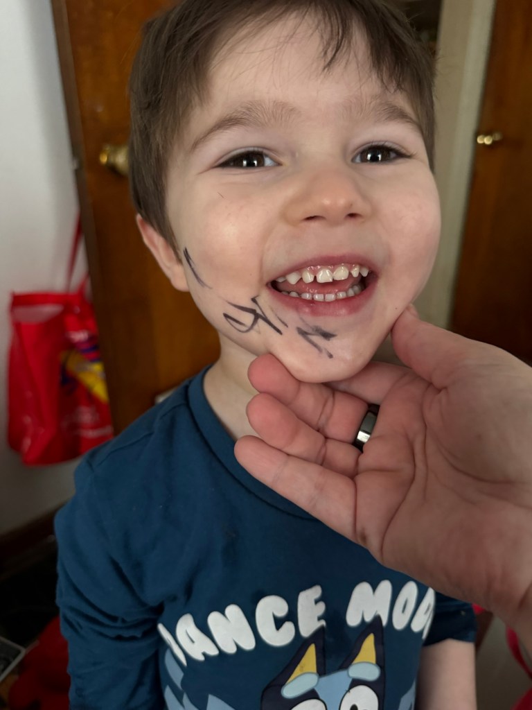 Back to the whirling dervish comment though… today he was visiting with me in the morning when I had some time between meetings. Then, he returned upstairs unbeknownst to his parents… and he found a Sharpie marker. Any questions? I managed to clean his hands before thinking to take a picture, but I grabbed this one before using a facial cleansing cloth to remove the strokes on his face.