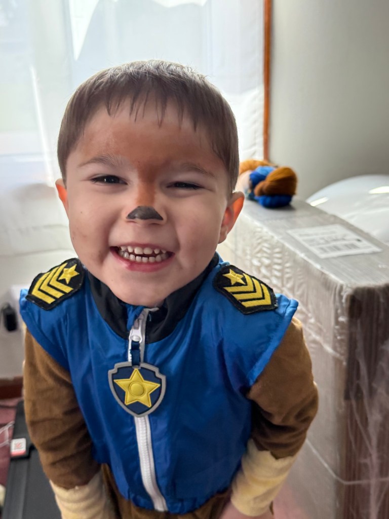 Another time this week, he came across his Halloween costume from last year – Chase from Paw Patrol. Naturally, he had to put it on – and then he was very insistent about having his “Chase face” as well, so Grandma was happy to oblige.