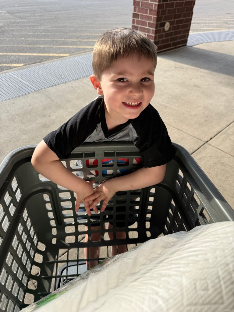It really would be hard to top last weekend’s Touch-a-Truck event, right? There will be more such events in the coming weeks, and I’m planning to take the munchkin to a couple other fun activities soon. This week was low-key, though. There was one evening when I took him to the car wash and then the grocery store. And while he often would insist on pushing the grocery cart, this time he wanted to “help” from the front of the cart. Well, that really slowed us down, as you can imagine. But as we were making our way to the registers to check out, I suggested an alternate activity for him – I wasn’t going to permit him to ride inside the cart (unless in the child seat), but he could stand on the lower rack and hold onto the cart. Mind you, I was very cautious and monitored his grip, particularly as we approached any kind of bumps. He seemed to like it, and the self-checkout monitor was also entertained by his antics.