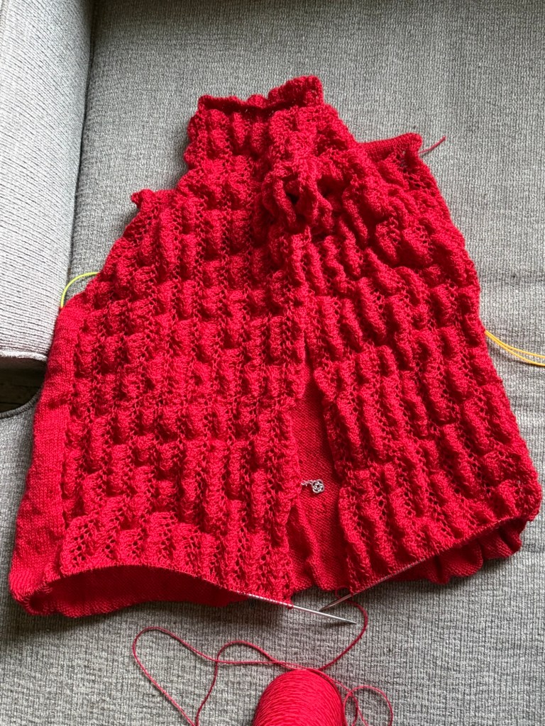 As usual, I put a significant amount of time into the lacy cardigan I’m knitting from a cone of fingering weight yarn I bought in Ireland. When I went to bed Sunday night, I had just started the ribbing section at the bottom of the body. With my spare time today I was able to finish the ribbing and bind off. I also wound off the remaining yarn which I’ll split into two cakes to work the sleeves. Y’all – there’s over 190 grams of yarn left. I shouldn’t have any trouble with yarn chicken!