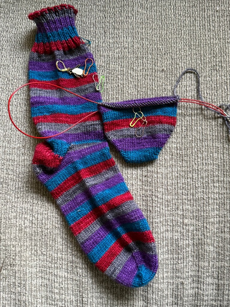 And my last project on the needles is the other sock project I have in the works. I had no trouble finishing the self-striping instep last week, and I opted for a solid color deep-stash remnant yarn to use for the toes/soles/heels of the project. That will allow me to work a reasonable leg on both socks.