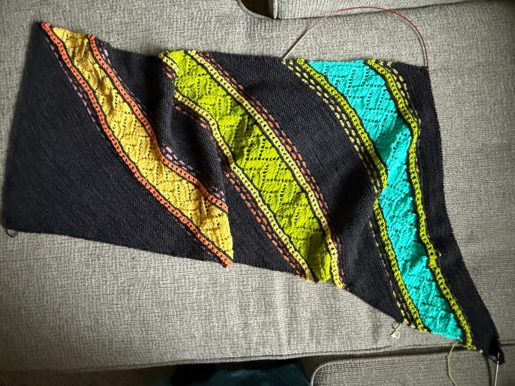 I’ll start with the easy one – the black & rainbow shawl – I’m closing in on the end of the third section, so I need to wind my sixth color before the weekend.