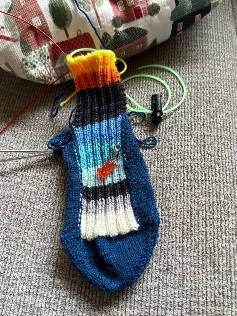Then I’ll jump to the vanilla socks. I hadn’t started the ribbing yet a week ago, but I was close. I finished the ribbing and bind-off, then cast on the toe of its mate so I could knit at the movies.